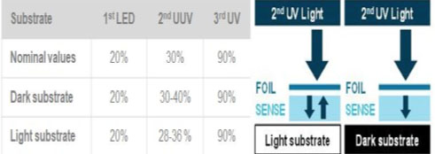 Yüzey rengi sense polymerin sertliğini belirler. Yüzey açık renk olursa 2. UV ışık yüzeyin yansımasına bağlı 2. kez sense polymerden geçmeli, bundan dolayı UV ışık yoğunluğu azalabilir. Aynı şekilde yüzey koyu renk olursa 2. UV ışık bir kez sense polimerden geçecek bundan dolayı ışık yoğunluğu daha fazla olabilir. |